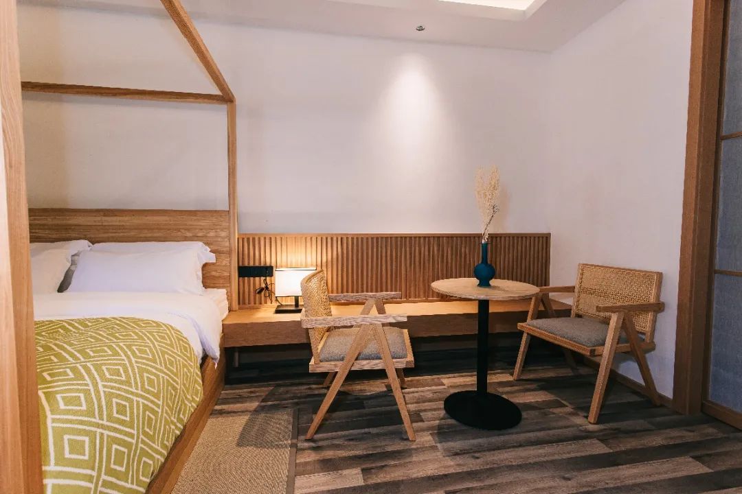 與壽山風(fēng)格相似的還有雙人房芙蓉、石牌。每當(dāng)陽光明媚時(shí),光會(huì)通過窗,映照在小木茶幾上,讓木頭的每一道年輪都清晰可見。面積約40平方,最多可住2人,一晚688元起住。